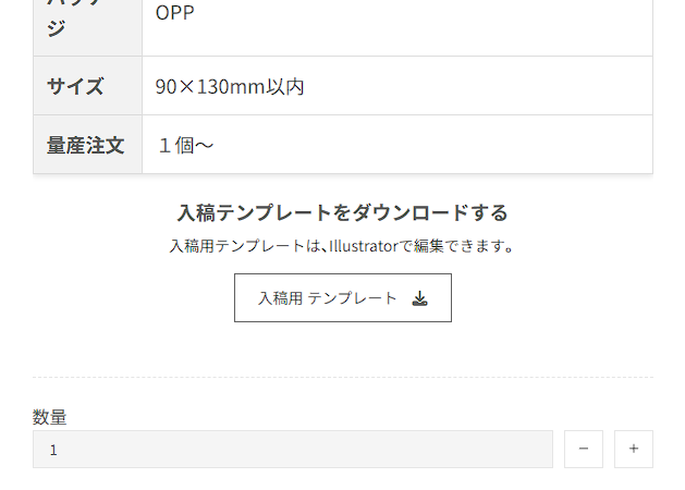 商品詳細ページにある「入稿用テンプレート」ボタンから、お使いのデザインソフト(Adobe Illustratorなど)に対応したテンプレートをダウンロードします。