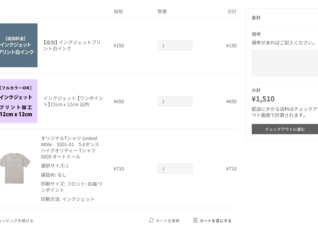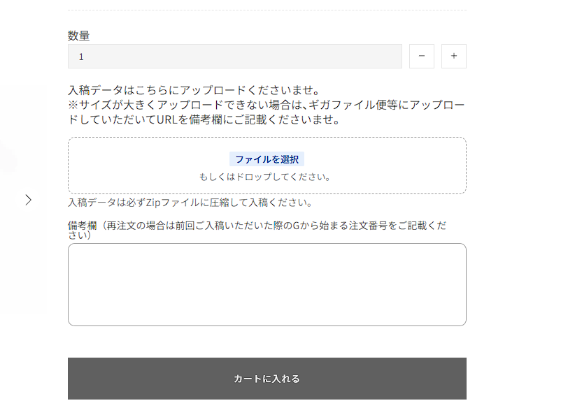 データのアップロードが完了したら、「カートに追加する」ボタンをクリックします。画面の案内に従って、お届け先情報や決済方法を入力すれば、注文は完了です。